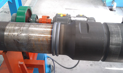 橫移裝置從焊機旁的等候位置取下鉆桿,并將其放到摩擦焊機中的夾緊和頂鍛滑臺的卡爪之間。用位于夾緊裝置處的定心裝置將鉆桿定心,然后用夾緊裝置把它夾緊。